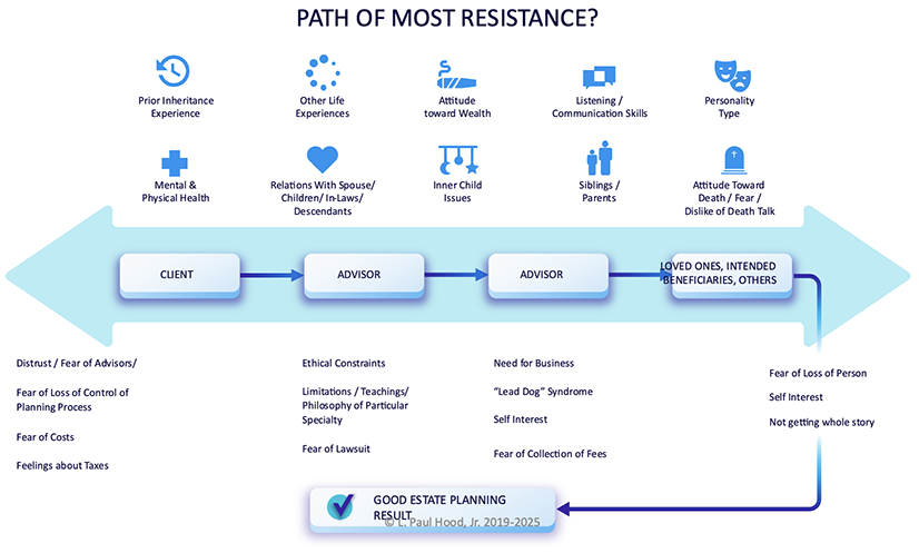 What is your client’s ultimate goal in their estate planning? As my first graphic, entitled “Path of Most Resistance©” (“Path©”) shows, the ultimate goal of your estate planning work should be a “good estate planning result.” I define a “good estate planning result” as one where property is properly transmitted as desired, and family relations among the survivors are not harmed during the estate planning and administration process. Note that I did not mention death taxes.