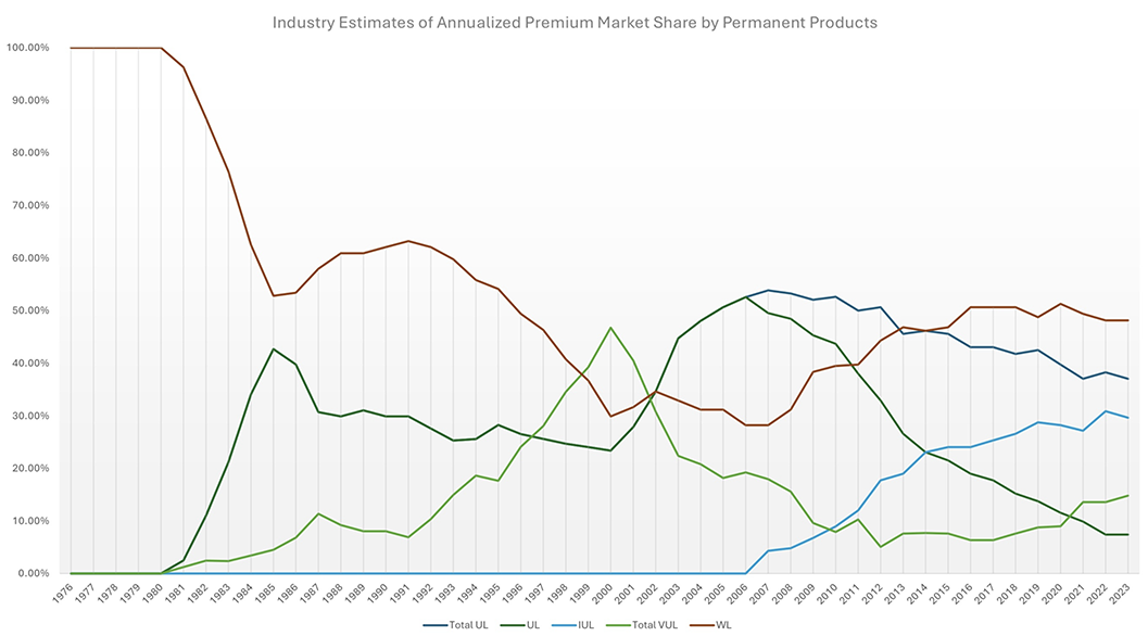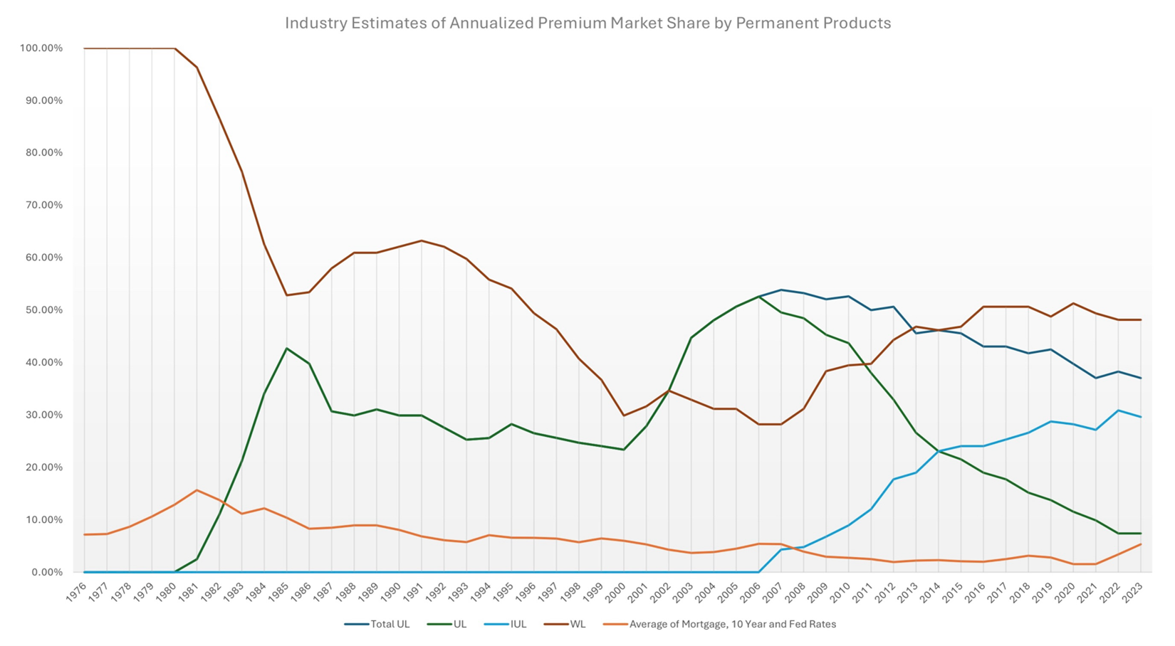 This article will discuss the variation in the sales of distinct types of life insurance over the past five decades and analyzes what is behind the back-and-forth swing in market share. The author has gathered all available data on sales of permanent life insurance and visually represents it in concert with what is concurrently happening in the financial markets to shed light on the often overlooked influence of market trends on life insurance choices. The goal is to provide insights that can help policy owners and advisors make more informed decisions in creating a life insurance portfolio that aligns with their best interests.