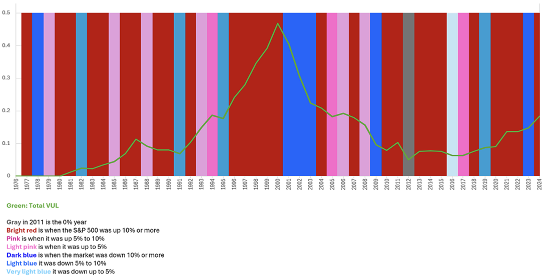 VUL was initially driven by the bull market of the early to mid eighties and went gangbusters during the high-flying nineties. It fell off a cliff just as fast from 2000-2002 with the awful markets. Every off-year results in a fall in, or leveling out of, market share. The flat market year of 2011 resulted in a pullback. Even a slightly up market year like 1987 resulted in a fall in sales due to the infamous October 1987 historic stock market drop. The great 2023 market returns drove VUL sales up 17% in 2024.