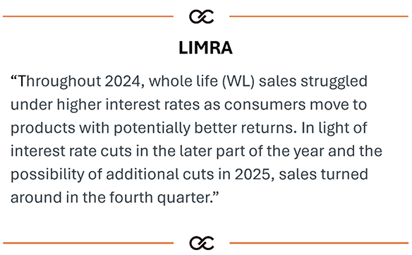 The 2024 stats show something else as well. The higher interest rates available pulled sales away from whole life insurance. Check out this comment from LIMRA[2]:
