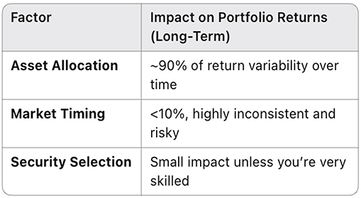 When this author came into the business in the early nineties, I was taught that over 90% of your portfolio return was due to asset allocation and less than 10% to market timing and investment selection. A quick look at the web as I was writing brought me this: